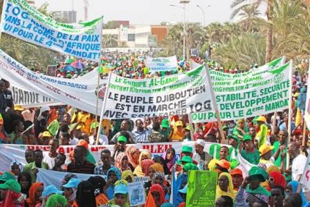 La population djiboutienne, repartie en collectifs distincts issus, à l’appel de la Société civile et des Organisations Non Gouvernementales (ONG), des différents quartiers de la capitale, de la banlieue, des régions de l’intérieur, des communautés culturelles et professionnelles du pays, a pris d’assaut l’espace public très tôt ce dimanche afin de prendre part à une marche populaire de soutien en faveur du Président Guelleh, sommé de poursuivre son action à la tête du pays et, à accepter ainsi le cri de cœur d’un peuple tout entier souhaitant le voir briguer un nouvel mandat à la Présidentielle 2016.