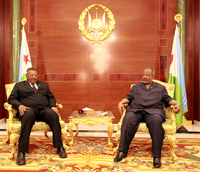 Ismail Omar Guelleh, s’est entretenu aujourd’hui, jeudi, en fin de matinée avec le Vice-Président soudanais, M Bakri Hassan Salah, en séjour de travail à Djibouti où, il est accompagné d’une importante délégation de son pays comprenant notamment, le Ministre des Affaires Etrangères, le Professeur Ibrahim Ghandour et le Ministre de la Défense, M Awad Abnaof.