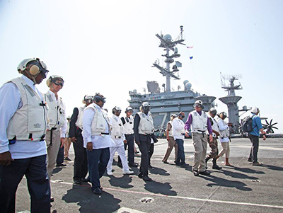 Outre le briefing reçu sur les missions de stabilisation et de sécurisation poursuivies par le Porte-avions américain dans la région, le Chef de l’Etat djiboutien eut droit à une démonstration de décollage et d’atterrissage des avions de combats portés par ce navire de guerre.