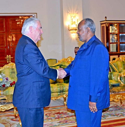 Le Président de la République, Son Excellence Ismail Omar Guelleh, a reçu aujourd’hui, vendredi, en milieu de matinée, au Palais Présidentiel, le Secrétaire d’Etat américain, M Rex Tillerson, en visite de travail à Djibouti dans le cadre d’une importante tournée qu’il effectue auprès de 5 pays du Continent noir.