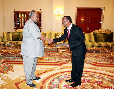 Ismail Omar Guelleh, a reçu ce lundi matin au Palais Présidentiel les Lettres de Créance du nouvel Ambassadeur de la République Démocratique et Fédérale d’Ethiopie auprès de la République de Djibouti, Son Excellence Shamebo Filamo Adebo.