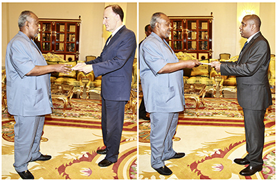 Le Président de la République, Son Excellence Ismail Omar Guelleh, a reçu aujourd’hui, lundi, en fin de matinée au Palais Présidentiel, les lettres de créances de deux nouveaux Ambassadeurs.