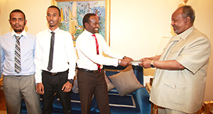 Le Président de la République, Son Excellence Ismail Omar Guelleh a reçu aujourd’hui, mardi, en fin de matinée, un groupe de trois jeunes djiboutiens ayant sillonné l’ensemble du territoire national afin de s’enquérir de visu de l’impact des efforts au développement entrepris sur l’ensemble du territoire national , Obock, Tadjourah, Ali-Sabieh, Dikhil, Arta et Djibouti (capitale et banlieue de Balbala) et, de relever aussi les doléances de leurs compatriotes de toutes les régions en vue de l’amélioration de leurs conditions de vie.